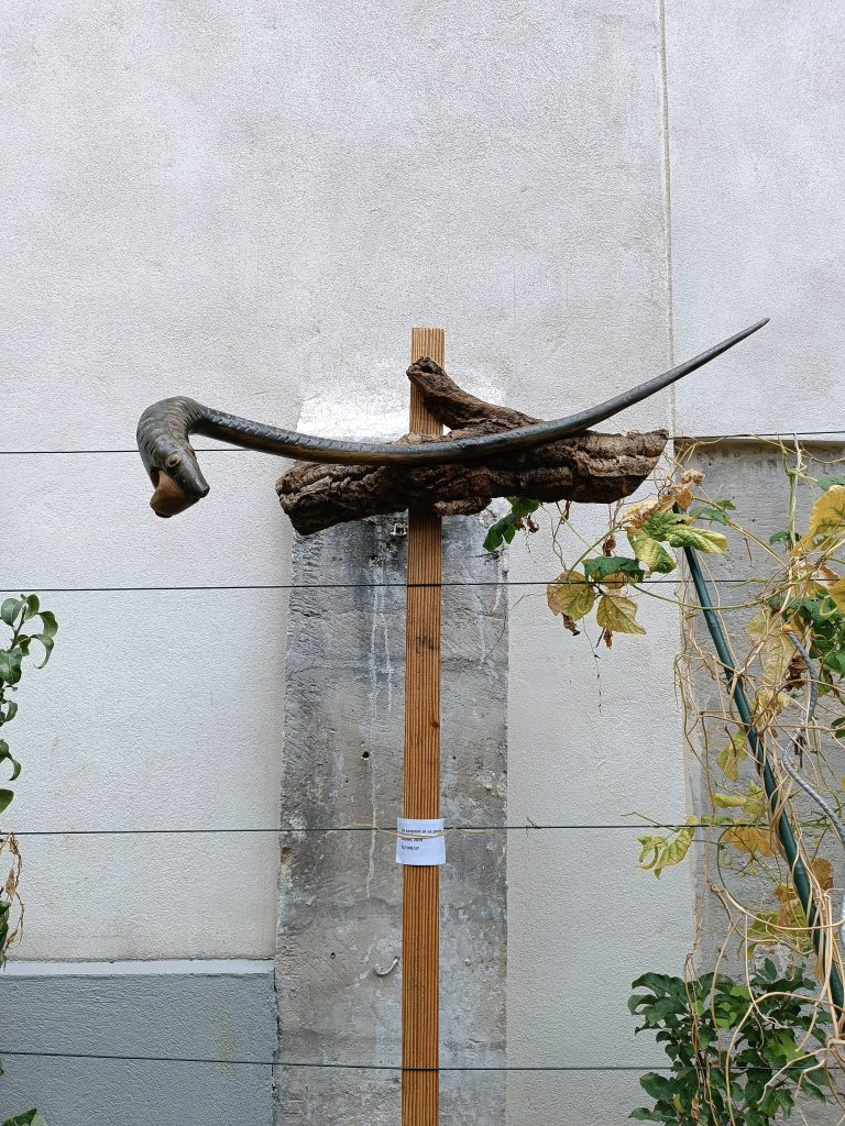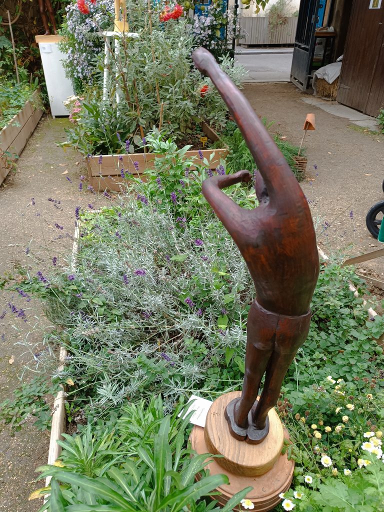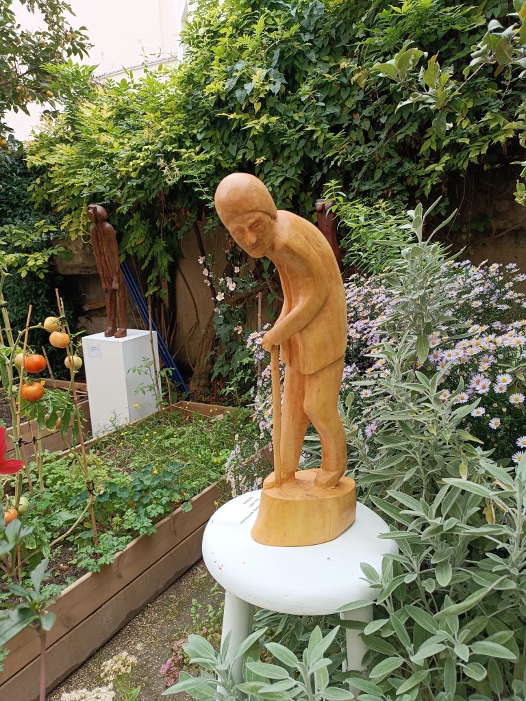 لە وێنەی سەر ریکلامەکەی پەیکەرێک نیشان دەدات کە کەسێکی بەتەمەنە، چەماوەتەوە و گۆچانێکی گرتووە، لە ژینگەیەکی دەرەوەدا دانراوە کە گیا و ڕوەک و داری لێیە؛ لە ناو باخچەیەکە لە گەڕەکێکی بازنەی سێهەمە لە پاریس، بە ناوی گەڕەکی Des Oiseaux (باڵندەکان) وەک سروشتێکی کێوی دەرەکەوێت کە ئەو ئامرازە هونەرییانە وەک بوونێکی خۆڕسکانە جێی خۆیان گرتووە.