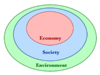 - ڕەهەندی ئابووری: لە پاش شەڕی دووەمی جیهانیەوە لە ساڵی ١٩٤٥ دا، ڕەهەندی ئابووری تەنها ڕەهەند بوو، کە جەختی تەنها لەسەر زیادکردنی کاڵا و سەرمایە دەکرد. هەموو توانای مرۆڤی تەنها لەپێناو بەرژەوەندی سەرمایەداریدا خەرج دەکرد؛ بەڵام لە ئابووری نوێ و بۆ گەشەی بەردەوامی کۆمەڵ و کۆمەڵگا، دەبێ ئەو قازانج و کار و توانایە، بەشێکی بۆ بنەمای ڕزگارکردن و بە باشترکردنی گوزەرانی چینی هەژار و دادپەروەری تەرخان بکرێت؛ دەبێ ژینگەش لە زیانی وەبەرهەمهێنان بپارێزرێ.